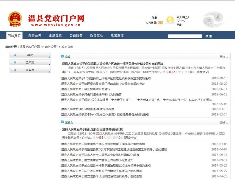 县党政們(men)戶(hu)网主(zhu)動(dòng)公(gōng)开规范性文(wén)件48箇(ge),其中(zhong)温政文(wén)件9箇(ge),温政文(wén)文(wén)件3箇(ge),温政办(bàn)文(wén)件36箇(ge),均按保密审查機(jī)製(zhi)审核后(hou)公(gōng)开;