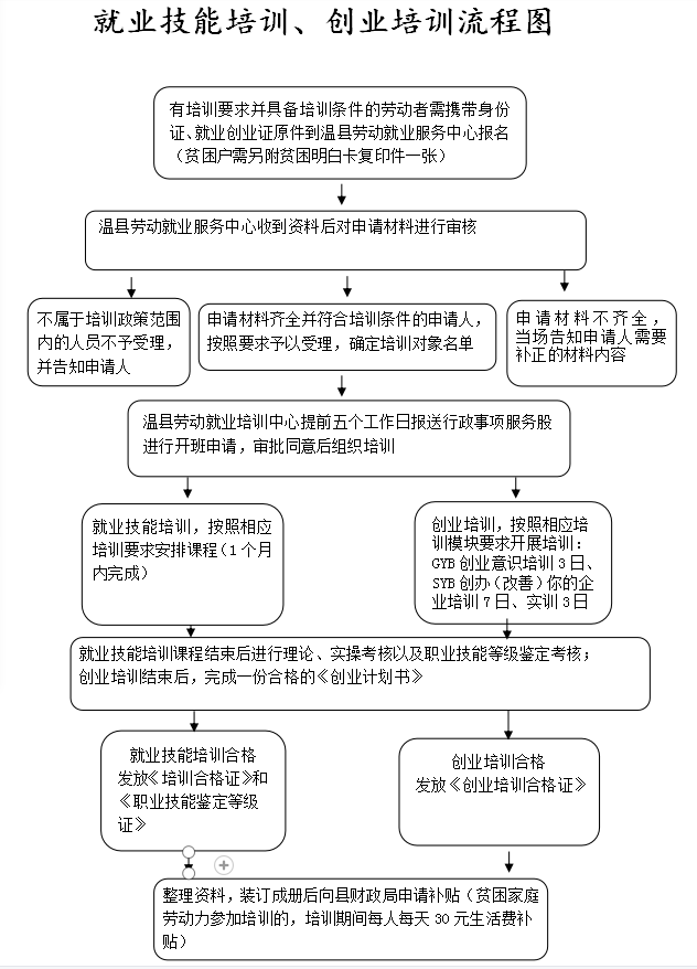 有(yǒu)培训要求并具(ju)備(bei)培训条件的(de)劳動(dòng)者需携带身份证、就业创业证原件到(dao)温县劳動(dòng)就业服務(wu)中(zhong)心报名(míng)(贫困戶(hu)需另附贫困明白卡复印件一(yi)张)